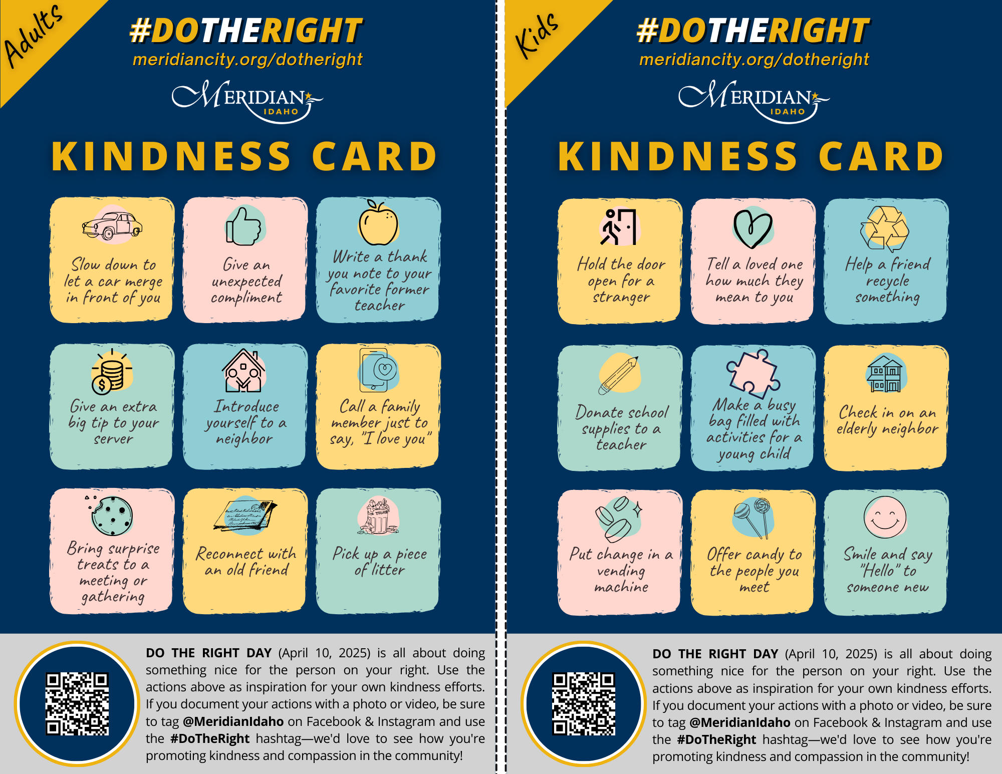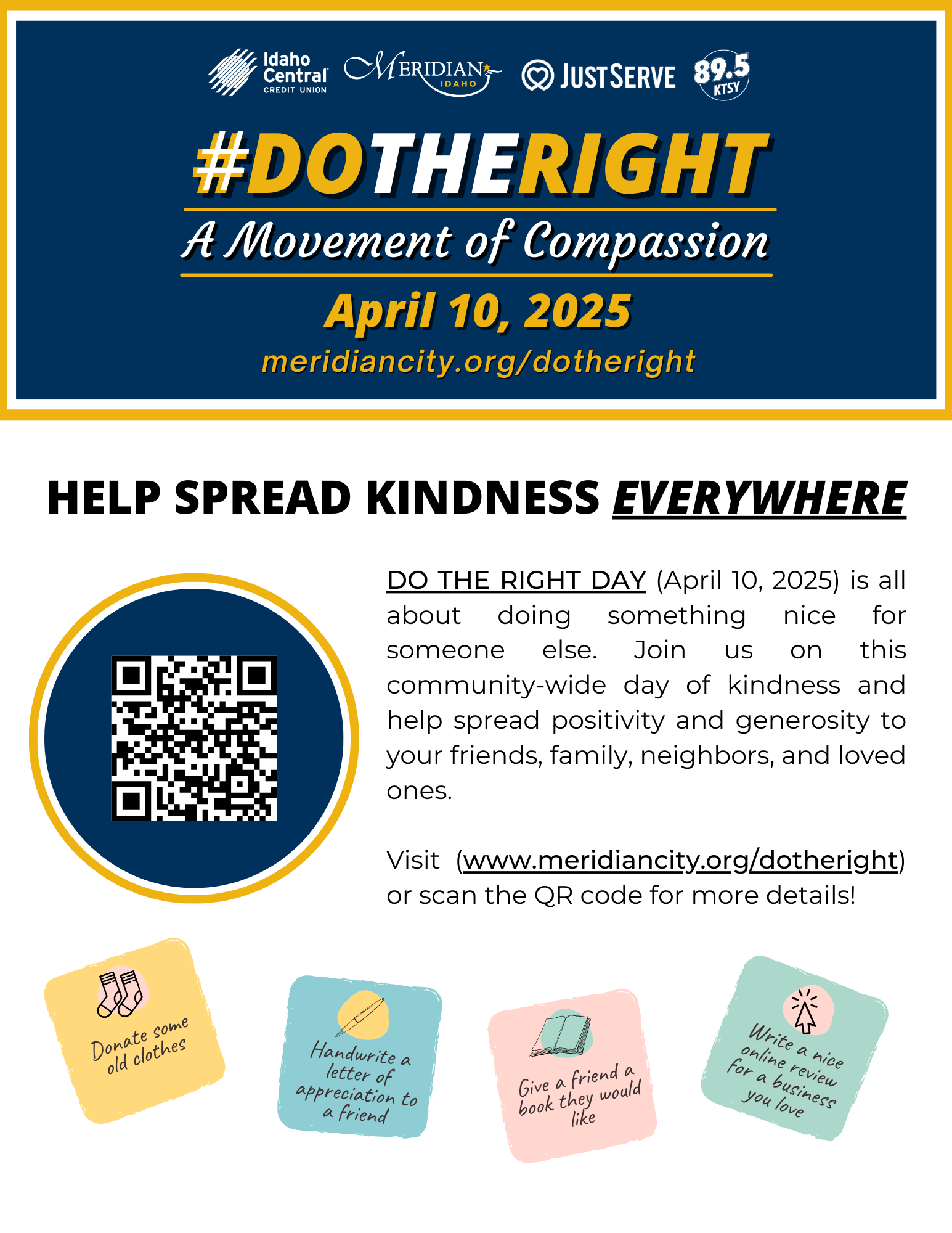 Kindness is contagious. That’s why the City of Meridian, with the help of many partners, observes DO THE RIGHT every April. The goal of the day is to encourage people of all ages to do something nice for the person to their right—whether it’s helping a neighbor drag their garbage can to the curb, handing a note of appreciation to a classmate, or buying coffee for a coworker. By taking the time to perform acts of service and kindness, we ensure that our community remains friendly, vibrant, and welcoming to all.